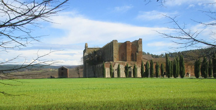 L’Italia è uno scrigno di tesori, ove si coniugano storia, paesaggio, arte e bellezza, ma arrivare nella verde vallata del comune di Chiusino, a pochi chilometri da Siena e trovarsi di fronte alle grandiose rovine dell’Abbazia di San Galgano è un’emozione impareggiabile che fonde la meraviglia con lo spirito ascetico, il senso del mistero con lo stupore. Un immenso rudere gotico, antico di 750 anni che tuttavia non ha perduto né il fascino né l’aspetto di un edificio che testimonia, oltre alla religiosità medioevale, la potenza raggiunta nel ‘300 dall’Ordine dei monaci cistercensi. Protetta dagli imperatori Enrico VI, Ottone IV e Federico II, malgrado calamità e pestilenze, nel ‘500 l’Abbazia era divenuta talmente florida da impensierire Papa Giulio II che scagliò contro di essa l’interdetto e in seguito a tale contesa cominciò l’abbandono della chiesa da parte dei monaci. Da allora iniziò la decadenza del luogo che prima fu spoliato della copertura, poi divenne cava di materiali; nel 1781 crollò definitivamente il tetto e cinque anni dopo un fulmine colpì il campanile. Il rudere venne perciò sconsacrato e lasciato alle ingiurie del tempo fino a quando, nel 1924, venne dato inizio a un restauro conservativo al fine di impedirne il totale degrado.