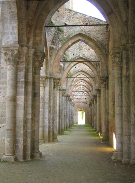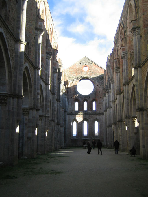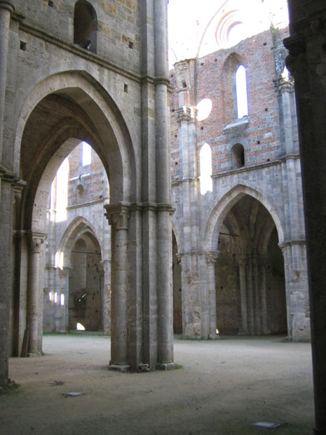 Sorta alla metà del XIII secolo ad opera dell'Ordine cistercense, la Chiesa abbaziale di San Galgano è un'immensa croce latina a tre navate, lunga 72 metri e larga 21 nel vano del transetto, con un'abside semicircolare in cui si aprono 6 monofore e un rosone. Sei campate e sedici pilastri spartiscono lo spazio geometricamente perfetto dell'interno: l'eleganza gotica delle strutture che si elevano svettanti verso il cielo, le arcate acute a doppia ghiera, la fuga di ogive nelle navate laterali costituiscono l'esempio più fulgido di uno stile gotico che risente delle influenze pisane e senesi, soprattutto nei decori, nelle bifore raffinate (una sola è ancora completa di colonnina!) e nei cento capitelli. Malgrado il forte slancio verticale, l'Abbazia esprime un gusto gotico più sobrio rispetto ai coevi esemplari francesi, invece la sua storia e il suo attuale aspetto rimandano ad altre due famose abbazie scozzesi, anch'esse dirute, ovvero Melrose Abbey e Kelso Abbey, costruite nel XII secolo, la prima dai monaci cistercensi e la seconda dai benedettini, le quali dopo una gloriosa storia di cristianità e di potere furono abbandonate dalla fine del XVI secolo per eventi diversi. Luoghi, questi, pittoreschi e misteriosi, immortalati da letterati e artisti romantici, come il romanziere Walter Scott o il pittore tedesco Caspar David Friedrich, ma anche spazi appropriati per concerti e per set cinematografici, come è accaduto nel film "Nostalgia" di Andej Tarkovsky premiato a Cannes nel 1983, il cui finale è stato ambientato proprio tra i resti maestosi dell'Abbazia di San Galgano.