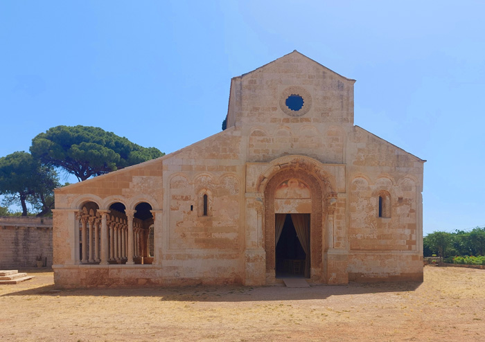 La facciata della Chiesa abbaziale di Santa Maria di Cerrate (LE), con il porticato esterno, XII e XIII secolo