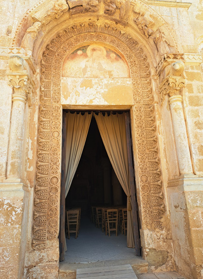 Il portale scolpito della Chiesa, contornato da un breve protiro (atrio) decorato con sculture dedicate al Vangelo