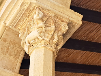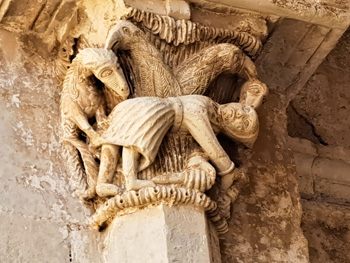 Uno dei capitelli del porticato in stile romanico con figura umana e animali fantastici (XIII sec)