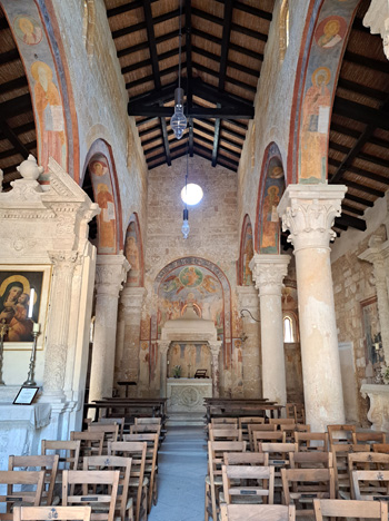 L'interno della Chiesa a tre navate e tetto a doppio spiovente, XII e XIII secolo
