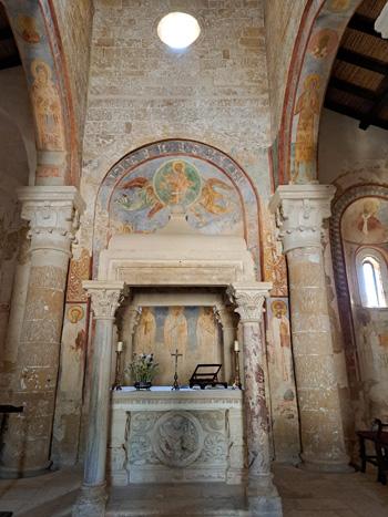 L'altare con baldacchino a colonne; sul fondo un affresco con figure di santi, 1269