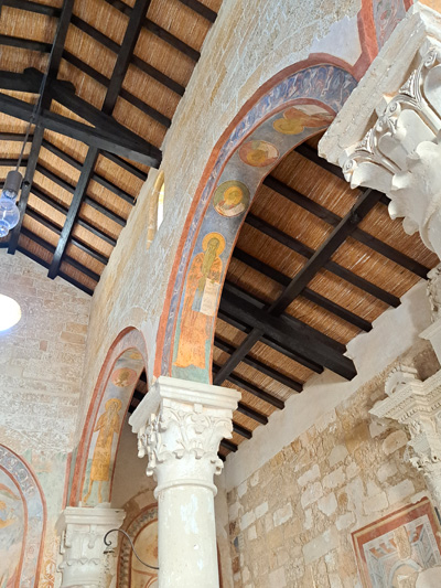 Molto interessanti ed espressivi sono i capitelli romanici del porticato esterno accanto alla Chiesa, decorati con figure di monaci, animali fantastici, come draghi e sirene, esseri mitologici, come centauri e grifoni e motivi vegetali stilizzati, mentre negli altorilievi del portale sono scolpite scene tratte dal Vangelo: Annunciazione, visitazione, re magi e Natività. L’interno della chiesa  come già accennato, è interamente decorato ad iniziare dai sottarchi, dove sono dipinti immagini di monaci e di eremiti; il catino absidale centrale è affrescato con l’ascensione di Cristo dipinta in stile bizantineggiante. Molto interessante la parete della navata settentrionale ove una teoria di santi porta i segni della picchiettatura, ovvero la tecnica usata per fare aderire gli affreschi. Sulla parete opposta molto intense le raffigurazione di Sant’Anna e Gioacchino e la Dormitio virginis.