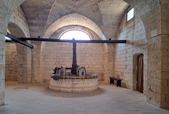Il complesso di Santa Maria di Cerrate non si limita all’austera e mistica chiesetta, bensì comprende diversi edifici sorti in periodi diversi, attestati fin dalla metà del 1600, come la presenza di un mulino e la più tarda Officina, il frantoio e la casa del massaro, questi ultimi risalenti al XIX secolo. Qui  si conservano le due grandi macine per la spremitura delle olive e i cosiddetti “trappiti”  negli ambienti ipogei: molto interessanti le macchine molitorie a palmento, ovvero le macine di pietra fatte ruotare da un mulo, nonché i pozzi di raccolta dell’olio e i torchi.