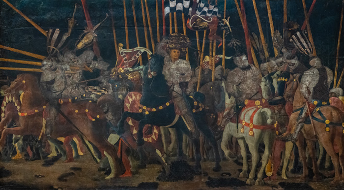 Paolo Uccello, Disarcionamento di Bernardino della Carda, tecnica mista su tavola 182x323 cm. 1438. Galleria degli Uffizi, Firenze |