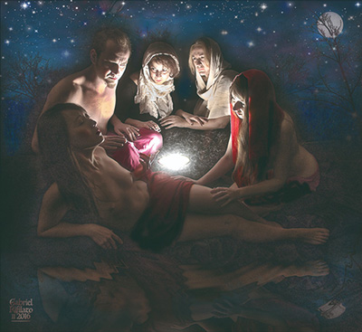 L'idea, come già accennato, nasce dalla scelta di un dipinto, di un'opera fotografica oppure ispirata a un celebre film: la scena viene ricreata con attori e figuranti e rielaborata attraverso trasposizioni simboliche o rinnovata nei contenuti. In alcuni dei tableaux vivants esposti accade, infatti, che i protagonisti di tele antiche, soprattutto seicentesche, subiscano attualizzazioni, a volte anche ironiche, oppure vere metamorfosi, quando il protagonista maschile diviene una fanciulla. Ciò accade in tre opere in mostra: "S. Sebastiano curato da Irene", una tela molto intensa dal luminismo caravaggesco, rielaborata da un'opera di Georges De La Tour; "S. Gerolamo scrivente", un tableau dalla spiccata sensualità e l'affascinante "Narciso", ambedue capolavori di Caravaggio, uno degli artisti preferiti dal Fotografo. Gabriel plasma il mito di Narciso in maniera inaspettata, rendendo il risultato artistico perturbante: egli lo rappresenta nel tableau come una giovane, anche lei accanto a uno specchio d'acqua in cui tuttavia non si riflette la propria immagine, come racconta invece il noto mito riguardante il bel Narciso. Il significato appare enigmatico e ognuno potrà trovare una personale spiegazione alla singolare metamorfosi del soggetto pittorico; io ho immaginato che Gabriel abbia scelto di immortalare nel tableau non Narciso, bensì la ninfa Eco, anche lei figura essenziale del mito greco, la quale s'innamora perdutamente, ma invano, del bellissimo fanciullo.